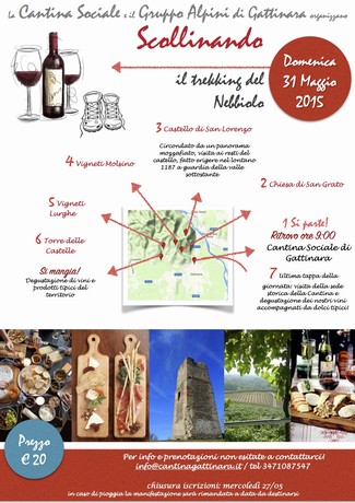 In concomitanza con l'evento Rosso di Maggio che vede l'apertura delle cantine del territorio, in collaborazione del Gruppo Alpini di Gattinara, abbiamo organizzato un trekking che attraversa i vigneti del Gattinara e offre la possibilità di degustare i prodotti tipici del territorio presso il punto panoramico della Torre delle Castelle.La giornata termina con la visita delle storiche cantine della nostra Cooperativa (anno fondazione 1908) dove si degusteranno i vini accompagnati dalla tradizionale pasticceria secca.